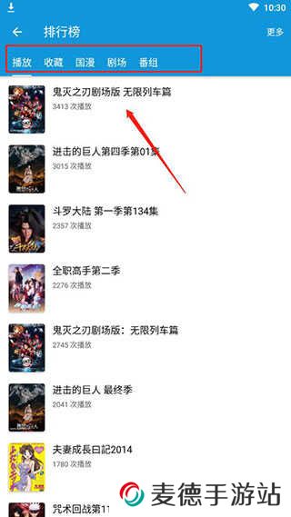 3、在排行榜中可以获取最受大家喜欢的动漫是什么,为大家提供了播放、收藏、国漫、剧场、番组等榜单,可以看到播放第一是大家都在寻找的鬼灭之刃剧场版无限列车篇;