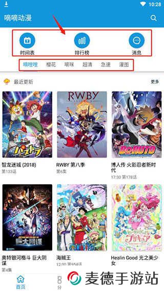 嘀哩嘀哩软件怎么用1、进入首页了,首页为大家展示了时间表、排行榜、消息等内容,在下面还为大家提供了很多中资源动漫,比如嘀哩哩、樱花等等,大家可以选择切换观看;