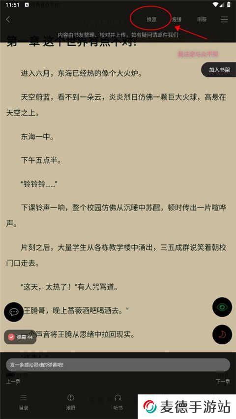 2、进入后点击屏幕中间,出现菜单栏,右上角位置点击换源